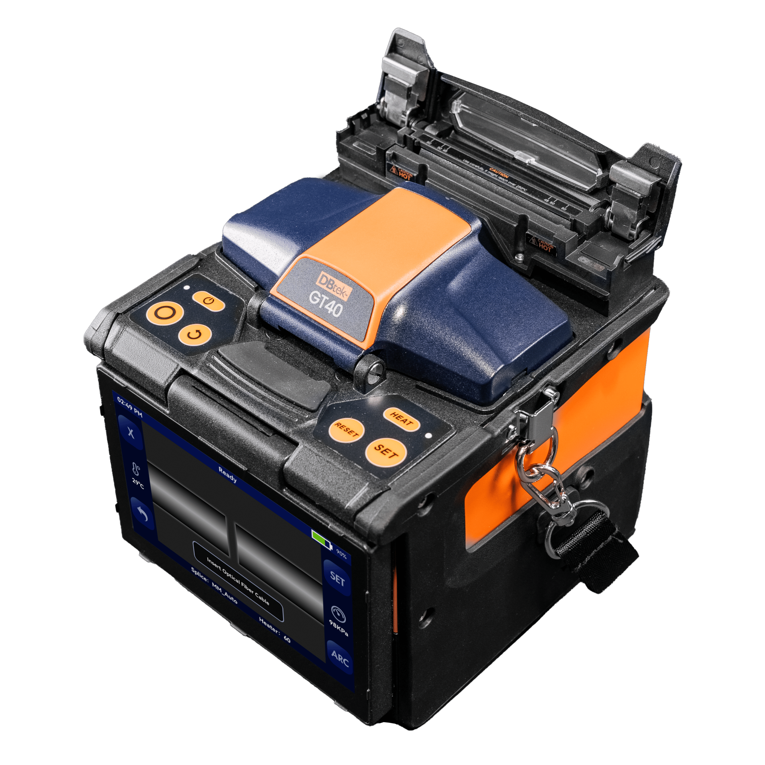 Designed for field reliability, the GT40 comes equipped with a detachable SOC holder and a powerful 9000 mAh battery, supporting up to 450 splicing cycles per charge. Paired with a high-precision fiber cleaver, it guarantees seamless and consistent results across all splicing tasks.